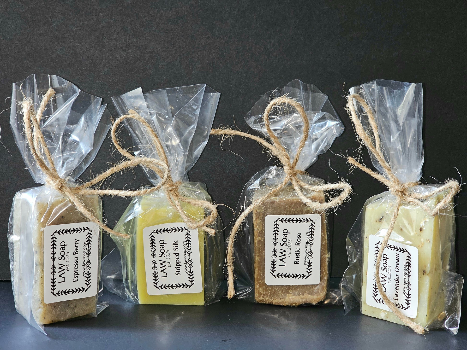 Treat your skin to a variety of handmade luxuries, Now in personal sized bars! This mixed pack includes: 1 Personal Sized Bar of Lavender Dreams with creamy oatmeal and floral-citrus bliss; 1 Personal Sized Bar of Rustic Rose with nourishing rose powder and warm floral-amber notes; 1 Personal Sized Bar of Espresso Berry with energizing coffee and fruity-citrus aroma; and 1 Personal Sized Bar of Stripped Silk, a silky, fragrance-free bar for naturally soft, smooth skin. Four unique bars, four skin-loving experiences!